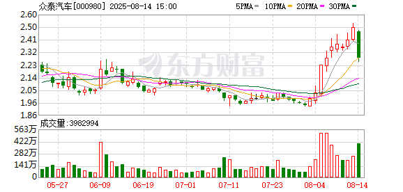 众泰汽车获融资买入0.39亿元,近三日累计买入1.42亿元