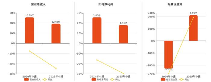 核心财务表现 - 2025年上半年营业收入为12.645亿元,较2024年同期的16.794亿元下降24.7% [5] - 净利润为1.535亿元,较2024年同期的2.041亿元下降24.8% [5] - 基本每股收益为0.1699元,较2024年同期的0.2399元下降29.2% [6] 资产负债表变化 - 货币资金从期初的5.929亿元下降至2.971亿元,减少49.9% [2] - 交易性金融资产从期初的3亿元增加至5.6亿元,增长86.7% [2] - 存货从期初的10.618亿元下降至8.323亿元,减少21.6% [2] - 资产总额从期初的52.114亿元下降至50.260亿元,减少3.6% [2] - 短期借款从期初的0.438亿元下降至0.245亿元,减少44.1% [2] 现金流量状况 - 经营活动现金流量净额为2.131亿元,较2024年同期的-2.323亿元显著改善 [7] - 投资活动现金流量净额为-2.830亿元,2024年同期为0.320亿元 [7] - 筹资活动现金流量净额为-2.295亿元,2024年同期为-1.253亿元 [9] - 期末现金及现金等价物余额为2.934亿元,较期初的5.929亿元减少50.5% [9] 业务结构分析 - 营业成本从6.921亿元下降至5.140亿元,减少25.7% [5] - 销售费用从6.068亿元下降至4.069亿元,减少32.9% [5] - 研发费用维持在0.659亿元,基本稳定 [5] - 母公司营业收入从9.218亿元下降至4.701亿元,减少49.0% [6] 所有者权益变动 - 归属于母公司所有者权益从37.532亿元下降至36.431亿元,减少2.9% [3] - 未分配利润从9.769亿元下降至8.668亿元,减少11.3% [3] - 少数股东权益从1.947亿元增加至2.045亿元,增长5.0% [3]