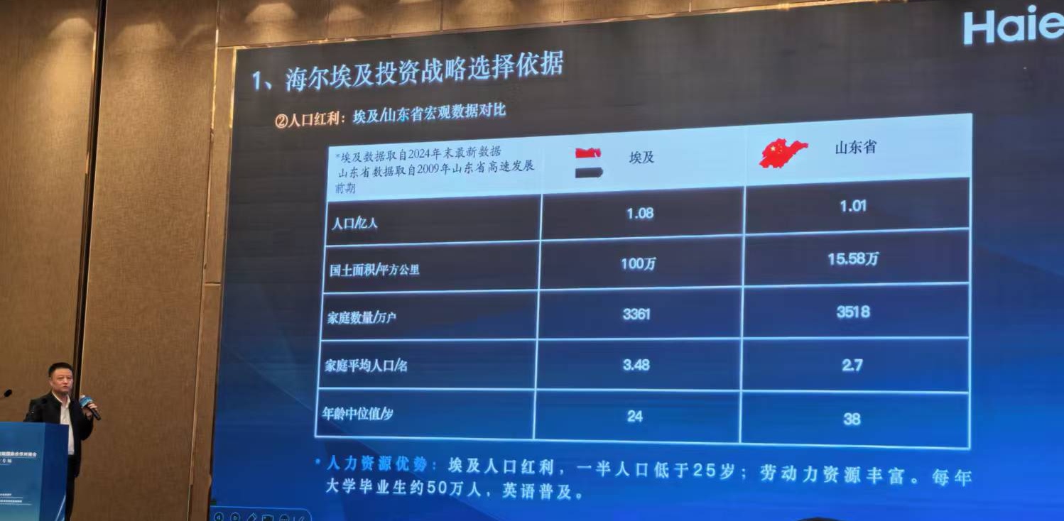 齐鲁晚报·齐鲁壹点 记者 蔡宇丹 到非洲挖掘人口红利! 9月28日,由山东省商务厅主办的山东省产业链供应链国际合作对接会北非专场上,作为山东投资非洲的代表性企业,海尔等一批在埃及深耕多年的经历, 给有意去非洲投资的山东企业释放了上述强烈信号。 1.先有市场,后建工厂,海尔加码埃及 "海尔进军埃及,先有市场,后建工厂。"海尔海外电器产业有限公司副总裁张庆福在对接会上说。 这些年,张庆福跑遍了非洲,2014年他就去埃及考察,布局制造基地,直到2023年3月,海尔在埃及的制造基地才开工建设。在这之前,海尔在埃及市场一 直有产品销售,但直到把埃及市场摸透,并且已经开发出适合埃及市场的产品后,海尔才确定建厂。 一旦决定投资,海尔落子很快。2023年11月,海尔埃及生态园厂房主体竣工,2024年3月一期投产,生产空调、电视与洗衣机,项目设计产能超150万台。如 今,海尔"埃及造"已实现出口,拿到家电行业出口增幅最快奖,获得埃及政府的认可。 海尔这个世界500强在埃及投资建厂,享受到的优惠政策中,最具价值的是获得埃及政府的"黄金许可证"。张庆福解释说,这个对国外投资者的优惠政策类 似于国内政务审批"最多跑一次",政府提供一 ...