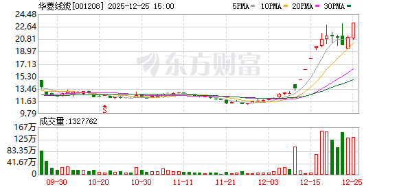 公司股价与交易表现 - 12月23日,华菱线缆股价上涨5.85%,报收22.26元/股,成交额达11.93亿元,换手率为20.96%,总市值为142.10亿元 [1] 公司基本情况 - 湖南华菱线缆股份有限公司成立于2003年7月1日,于2021年6月24日上市,公司位于湖南省湘潭市高新区 [1] - 公司主营业务为电线电缆的研发、生产及销售 [1] - 主营业务收入构成:特种电缆占50.37%,电力电缆占39.64%,电气装备用电缆占8.19%,其他(补充)占1.38%,裸导线占0.25%,其他线缆占0.16% [1] 主要流通股东动态 - 中邮基金旗下的中邮军民融合灵活配置混合A(004139)于第三季度新进成为公司十大流通股东,持有180万股,占流通股比例为0.68% [2] - 基于股价上涨测算,该基金在12月23日当日浮盈约221.4万元 [2] 相关基金产品表现 - 中邮军民融合灵活配置混合A(004139)成立于2017年4月1日,最新规模为8.59亿元 [2] - 该基金今年以来收益率为42.83%,在同类8088只基金中排名1571位;近一年收益率为38.01%,在同类8057只基金中排名1721位;成立以来累计收益率为120.05% [2] - 该基金的基金经理为王高,其累计任职时间为5年170天,现任基金资产总规模为19.15亿元,任职期间最佳基金回报为54.51%,最差基金回报为-29.36% [3]