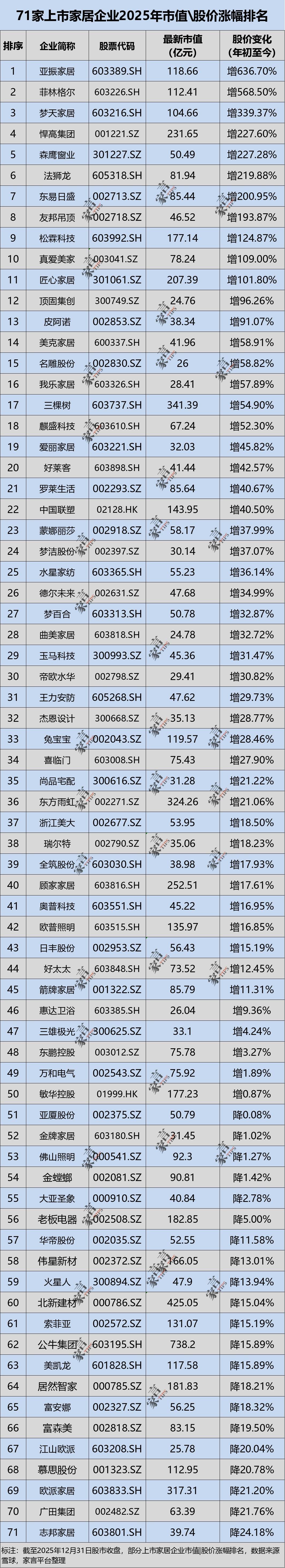 71家上市家居企业2025年市值\股价涨幅排名 从股价涨幅来看,排名呈现全然不同的格局。亚振家居以636.70%的惊人涨幅位居第一。菲林格尔、梦天家居、悍高集团等企业紧随其后,前11名企业 涨幅均超过100%。 这些企业虽在市值规模上尚未跻身绝对的头部,但其高速成长性获得了资本市场的积极反馈,反映了行业内部创新转型、细分赛道突围的活跃态势。 | 排序 | 企业简称 | 股票代码 | 最新市值 | 股价变化 | | --- | --- | --- | --- | --- | | | | | (亿元) | (年初至今) | | 1 | 亚振家居 | 603389.SH | 118.66 | 增636.70% | | 2 | 菲林格尔 | 603226.SH | 112.41 | 增568.50% | | 3 | 梦天家居 | 603216.SH | 104.66 | 增339.37% | | 4 | 悍高集团 | 001221.SZ | 231.65 | 增227.60% | | 5 | 森鹰窗 / | 301227.SZ | 50.49 | 增227.28% | | 6 | 法狮龙 | 605318.SH | ...