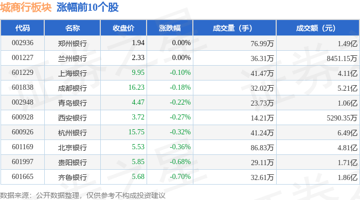 证券之星消息,1月8日城商行板块较上一交易日下跌0.89%,重庆银行领跌。当日上证指数报收于 4082.98,下跌0.07%。深证成指报收于13959.48,下跌0.51%。城商行板块个股涨跌见下表: | 代码 | 名称 | 收盘价 | 涨跌幅 | 成交量(手) | | 成交额(元) | | --- | --- | --- | --- | --- | --- | --- | | 002936 | 郑州银行 | 1.94 | 0.00% | | 76.99万 | 1.49亿 | | 001227 | 兰州银行 | 2.33 | 0.00% | | 36.31万 | 8451.15万 | | 601229 | 上海银行 | 9.95 | -0.10% | | 41.47万 | 4.11亿 | | 601838 | 成都银行 | 16.23 | -0.18% | 1 | 32.02万 | 5.21亿 | | 002948 | 青岛银行 | 4.47 | -0.22% | | 23.73万 | 1.06亿 | | 600928 | 西安银行 | 3.72 | -0.27% | | 14.21万 | 5290.35万 ...