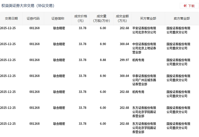 大宗交易概况 - 2025年12月25日,联合精密发生大宗交易,总成交50.68万股,总成交额1711.97万元,占该股当日总成交额的5.87% [1] - 本次大宗交易成交价为33.78元,较当日市场收盘价38.45元折价12.15% [1] 交易明细分析 - 当日共发生6笔大宗交易,每笔成交价格均为33.78元 [2] - 6笔交易成交量分别为6.00万股、8.90万股、8.88万股、8.90万股、6.00万股、6.00万股,对应成交金额分别为202.68万元、300.64万元、299.97万元、300.64万元、202.68万元、202.68万元 [2] - 所有交易的卖方营业部均为国投证券股份有限公司重庆分公司 [2] 买卖双方信息 - 买方营业部包括平安证券股份有限公司北京市分公司、中信证券股份有限公司北京上地证券营业部、华泰证券股份有限公司广州云城东路证券营业部、东方证券股份有限公司北京学院路证券营业部,以及两个“机构专用”席位 [2] - 卖方高度集中,全部6笔交易均来自国投证券股份有限公司重庆分公司 [2]