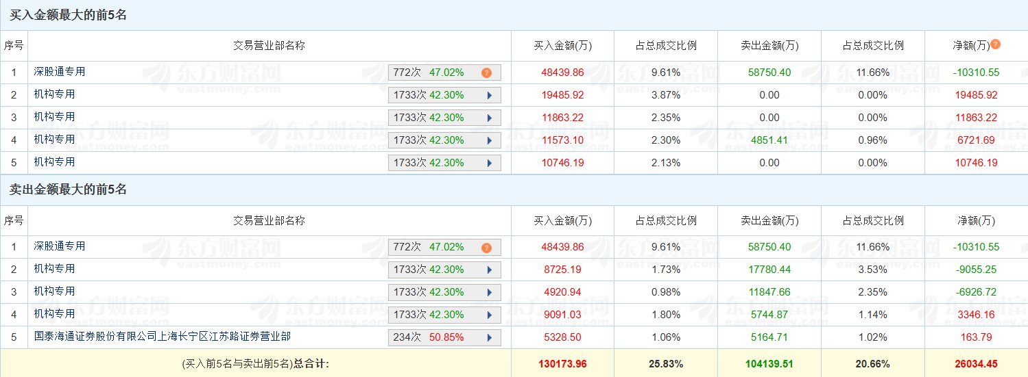 股价表现 - 公司股价实现涨停3连板并创历史新高 换手率达19.04% 成交额50.4亿元[1] 资金流向 - 深股通买入4.84亿元 卖出5.88亿元 净卖出1.03亿元[1] - 七家机构合计买入7.64亿元 卖出4.02亿元 净买入3.62亿元[1] - 龙虎榜席位全天净买入2.6亿元 其中买入总额13.02亿元 卖出总额10.41亿元[1] 买入席位分析 - 深股通专用席位买入4.84亿元 占总成交比例9.61%[1] - 四家机构专用席位分别买入1.95亿元 1.19亿元 1.16亿元和1.07亿元 合计占成交比例10.65%[1] 卖出席位分析 - 深股通专用席位卖出5.88亿元 占总成交比例9.61%[1] - 三家机构专用席位分别卖出0.87亿元 0.49亿元和0.91亿元[1] - 国泰君安证券上海长宁区江苏路营业部卖出0.53亿元 占总成交比例1.06%[1]