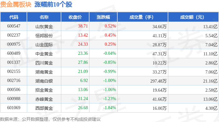 证券之星消息,12月31日贵金属板块较上一交易日下跌0.23%,晓程科技领跌。当日上证指数报收于3968.84,上涨0.09%。深证成指报收于 13525.02,下跌0.58%。贵金属板块个股涨跌见下表: | 代码 | 名称 | 收盘价 | 涨跌幅 | 成交量(手) | 成交额(元) | | | --- | --- | --- | --- | --- | --- | --- | | 600547 | 山东黄金 | 38.71 | 0.52% | 34.66万 | | 13.41 (Z | | 002237 | 恒邦股份 | 13.42 | 0.45% | 41.11万 | | 5.54亿 | | 000975 | 山金国际 | 24.33 | 0.25% | 28.87万 | | 7.04亿 | | 600489 | 中全黄金 | 23.36 | -0.04% | 47.31万 | | 11.10亿 | | 001337 | 四川黄金 | 27.86 | -0.85% | 10.22万 | | 2.86亿 | | 002155 | 湖南黄金 | 21.09 | -0.99% | 33.27万 | | 7.06 ...