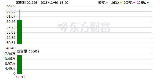 C誉帆(001396)上市首日上涨124.36%,换手率达75.03%,成交额为9.41亿元。 交易公开信息数据显示,该股上市首日,龙虎榜上榜的前五大买卖营业部合计成交1.14亿元,其中,买 入成交额为7797.19万元,卖出成交额为3618.53万元,合计净买入4178.66万元。其中,有1家机构专用 席位上榜,合计净卖出515.67万元。(数据宝) 近期上市新股首日融资融券交易明细 | 代码 | 简称 | 上市日期 | 上市首日涨跌 | 上市首日融资余额 | 占流通市值比 | 上市首日融券余额 | | --- | --- | --- | --- | --- | --- | --- | | | | | (%) | (万元) | 例(%) | (万元) | | 001369 | C双欣 | 2025.12.30 | 187.30 | 7937.29 | 2.01 | 0.00 | | 001396 | C誉帆 | 2025.12.30 | 124.36 | 2116.24 | 1.91 | 0.00 | | 688809 | C强一 | 2025.12.30 | 165.61 | 54913.71 | 9.9 ...