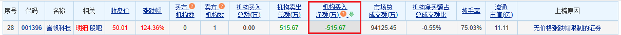 誉帆科技龙虎榜:1家机构进卖出前5 净卖出共516万元