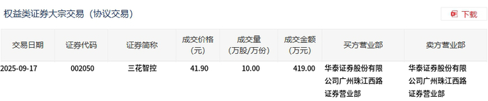 交易概况 - 三花智控于2025年9月17日发生大宗交易 成交10万股 成交金额419万元 成交价格41.9元/股 [1][2] - 该笔交易占当日总成交额比例0.03% 成交价格与市场收盘价41.9元持平 [1] 交易细节 - 交易方式为权益类证券大宗交易(协议交易) 证券代码002050 [2] - 买方与卖方营业部均为华泰证券股份有限公司广州珠江西路证券营业部 [2] - 成交数量10万股 折合成交金额419万元 [1][2]