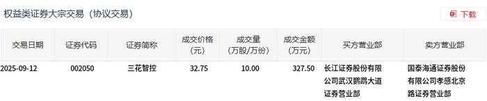 大宗交易概况 - 2025年9月12日三花智控发生大宗交易成交10万股 成交金额327.5万元 占当日总成交额比例0.05% [1] - 成交价格32.75元 较市场收盘价34.5元折价5.07% [1] 交易细节 - 买方为长江证券武汉鹦鹉大道证券营业部 卖方为国泰海通证券孝感北京路证券营业部 [2] - 证券代码002050 以每股32.75元价格成交10万股 [2]