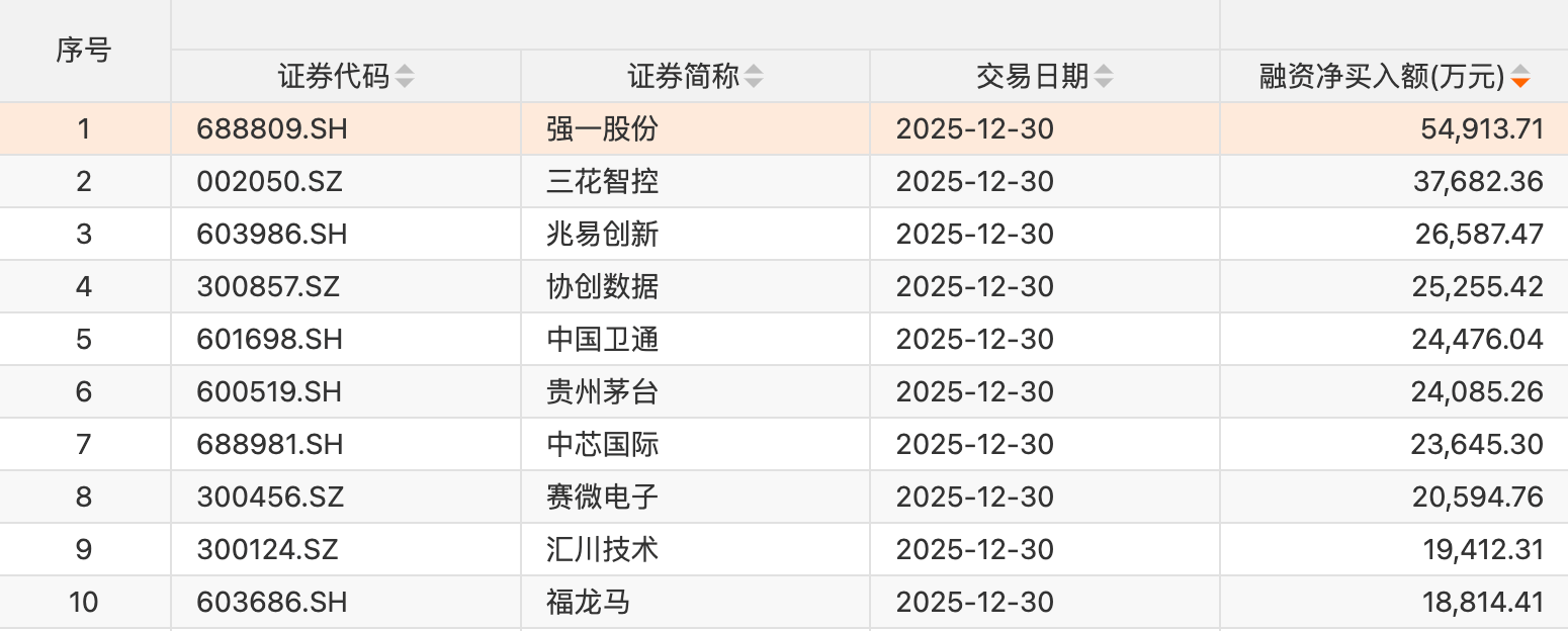 A股两融市场概况 - 截至12月30日,A股两融余额为25552.84亿元,较上一交易日增加35.5亿元,占A股流通市值比例为2.59% [1] - 当日两融交易额为2300.23亿元,较上一交易日减少0.3亿元,占A股成交额的10.63% [1] 行业融资净买入情况 - 申万31个一级行业中有20个行业获融资净买入 [1] - 汽车行业获融资净买入额居首,当日净买入11.77亿元 [1] - 获融资净买入居前的行业还有机械设备、电子、国防军工、计算机、传媒、家用电器等 [1] 个股融资净买入情况 - 37只个股获融资净买入额超1亿元 [1] - 强一股份获融资净买入额居首,净买入5.49亿元 [1] - 融资净买入金额居前的还有三花智控、兆易创新、协创数据、中国卫通、贵州茅台、中芯国际、赛微电子、汇川技术、福龙马等 [1] 汽车行业投资观点 - 政策面对汽车消费持续给予支持,叠加新能源汽车销量稳步增长 [2] - 甬兴证券继续维持汽车行业“增持”评级 [2] - 整车方面,建议关注智能化水平领先、技术周期与车型周期形成共振的整车企业 [2] - 零部件方面,看好电动化与智能化带来的增量环节,以及AIDC液冷相关产业链 [2]