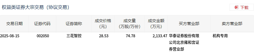 大宗交易概况 - 2025年8月15日发生大宗交易成交74.78万股[1][2] - 成交金额达2133.47万元[1][2] - 成交价格28.53元与市场收盘价完全持平[1] 交易结构细节 - 该笔交易占当日总成交额的0.47%[1] - 买方为华泰证券北京雍和宫证券营业部[2] - 卖方显示为机构专用席位[2] 证券基本信息 - 交易标的为三花智控(证券代码:002050)[2]