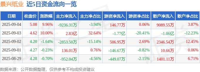 股价表现 - 景兴纸业9月4日涨停收盘 收盘价5.08元 涨幅9.96% [1] - 该股于9点44分涨停 12次打开涨停 收盘封单资金2327.45万元 占流通市值0.41% [1] 业绩表现 - 半年报净利润同比增长15.37% 盈利改善提振市场信心 [1] 战略投资 - 公司间接投资宇树科技 涉足人形机器人概念 引发市场预期 [1] 公司行动 - 近期发布股份回购进展公告 强化投资者对公司价值的认可 [1] 行业环境 - 人民币升值预期降低进口木浆成本 利好造纸行业成本端 [1] - 该股属于造纸 人民币升值受益 一带一路概念热股 [2] - 当日造纸概念上涨1.33% 人民币升值受益概念上涨0.77% [2] 资金流向 - 9月4日主力资金净流出9236.31万元 占总成交额3.94% [1] - 游资资金净流入146.77万元 占总成交额0.06% [1] - 散户资金净流入9089.55万元 占总成交额3.87% [1] - 9月3日主力资金净流入2.83亿元 占比32.64% [2] - 9月2日主力资金净流出2853.50万元 占比15.14% [2]