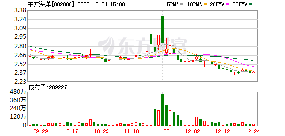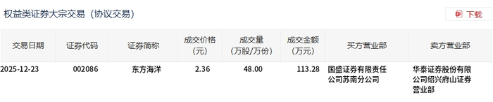 | 权益类证券大宗交易 (协议交易) | | --- | 12月23日,东方海洋大宗交易成交48万股,成交额113.28万元,占当日总成交额的1.4%,成交价2.36 元,较市场收盘价2.36元持平。 | 交易日期 | 证券代码 | 证券简称 | 成交价格 | 成交量 | 成交金额 (万元) | 买方营业部 | 卖方营业部 | | --- | --- | --- | --- | --- | --- | --- | --- | | | | | (元) | (万股/万份) | | | | | 2025-12-23 | 002086 | 东方海洋 | 2.36 | 48.00 | | 113.28 国盛证券有限责任 | 华泰证券股份有限 | | | | | | | | 公司苏南分公司 | 公司绍兴府山证券 | | | | | | | | | 营业部 | ...