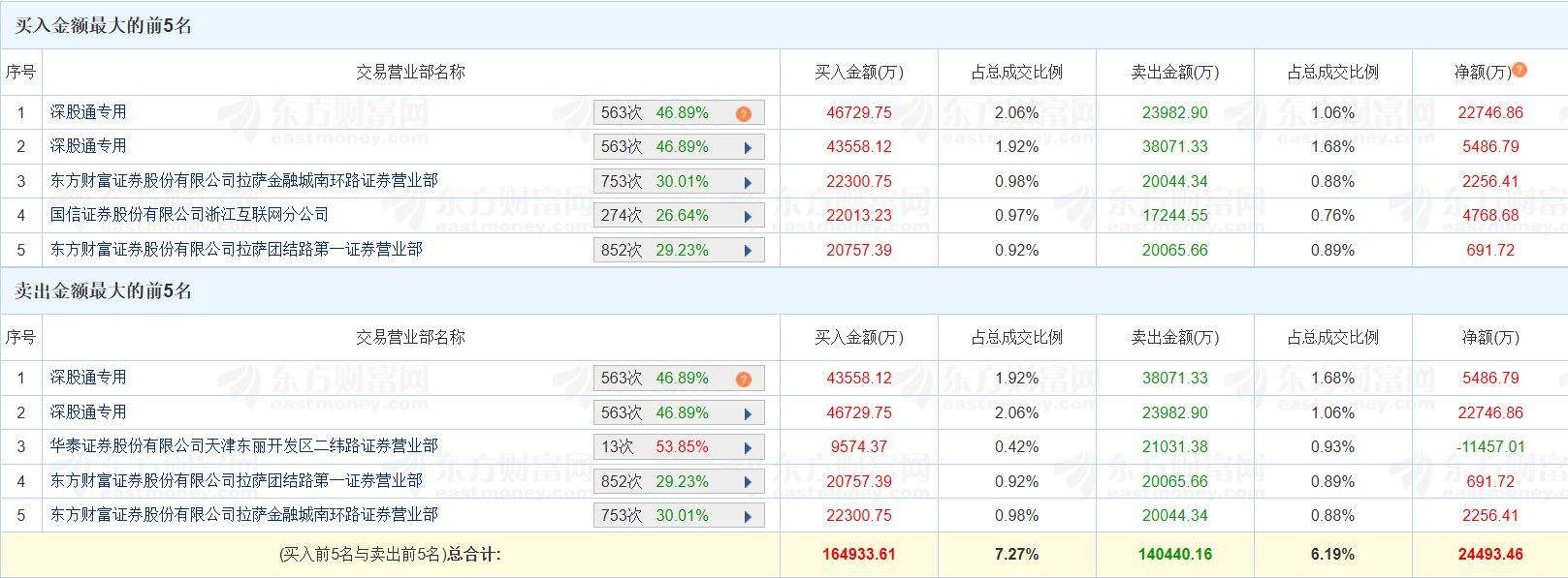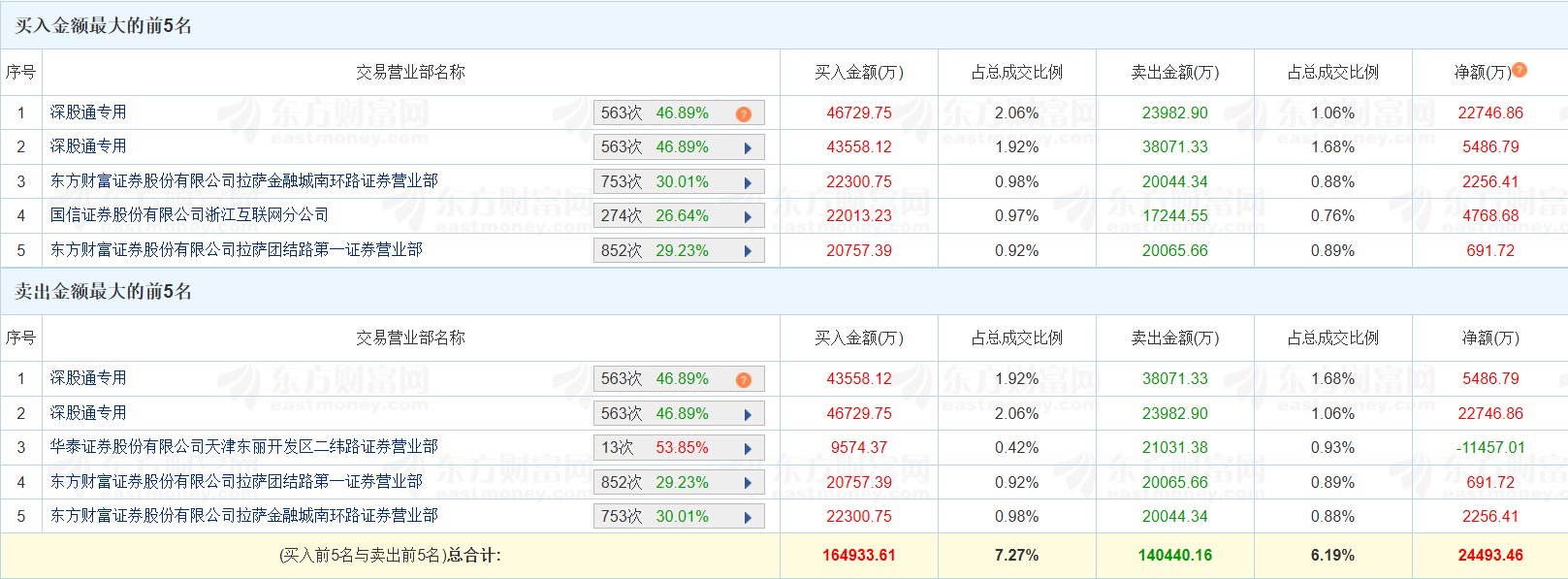 股价表现与交易数据 - 公司今日股价上涨7.36% 全天换手率达51.62% 成交额为88.75亿元 振幅为8.15% [2] - 近半年公司累计上榜龙虎榜39次 上榜次日股价平均涨2.85% 上榜后5日平均涨12.01% [2] 龙虎榜资金动向 - 深股通净买入3292.64万元 为第一大买入及卖出营业部 买入金额2.39亿元 卖出金额2.06亿元 [2][3] - 前五大买卖营业部合计成交14.63亿元 买入成交额6.70亿元 卖出成交额7.93亿元 合计净卖出1.22亿元 [2] - 营业部席位合计净卖出1.55亿元 其中华泰证券天津东丽开发区营业部卖出1.31亿元 [2][3] 主力资金流向 - 今日主力资金净流出5.73亿元 其中特大单净流出3.52亿元 大单资金净流出2.21亿元 [2] - 近5日主力资金净流入6.32亿元 [2] 融资融券情况 - 最新两融余额11.37亿元 其中融资余额11.37亿元 融券余额0.27万元 [3] - 近5日融资余额增加2.35亿元 增幅25.99% 融券余额增加761元 增幅39.21% [3] 营业部交易明细 - 东方财富证券拉萨金融城南环路营业部买入8756.80万元 卖出7349.81万元 [3][4] - 国信证券浙江互联网分公司买入8671.91万元 卖出5958.06万元 [3] - 东方财富证券拉萨东环路第一营业部买入8602.91万元 卖出5993.65万元 [3]