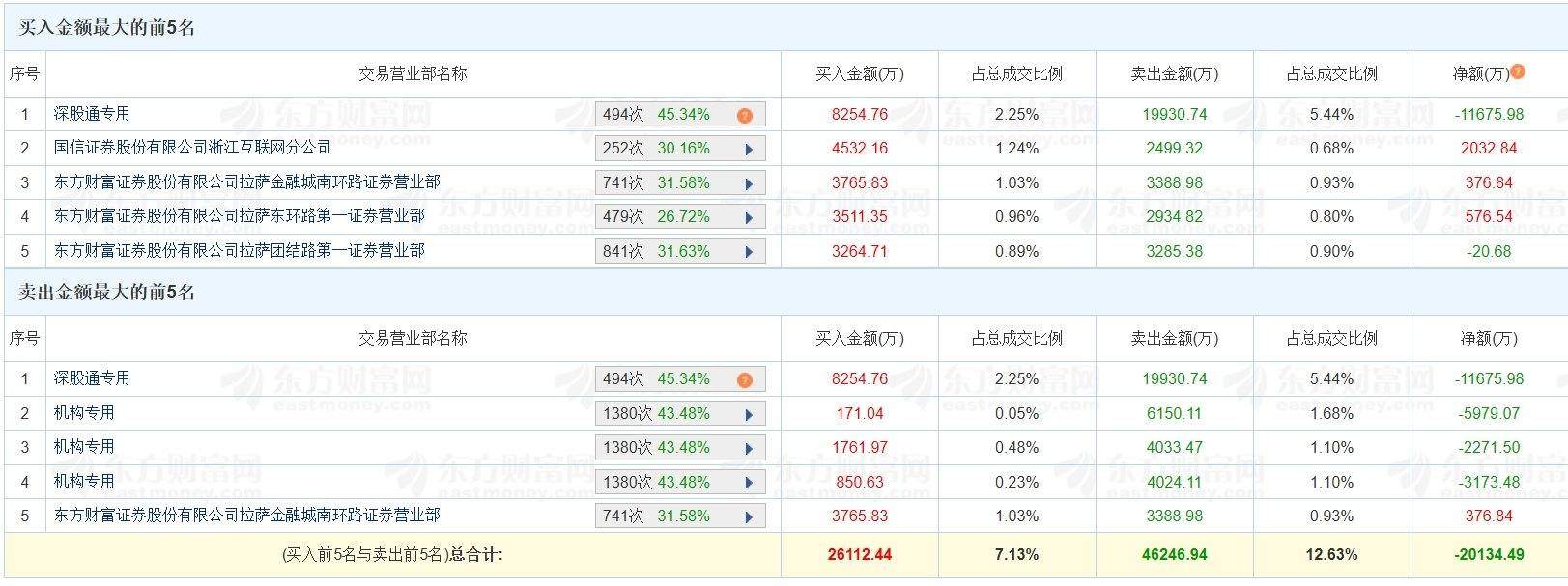 股价表现 - 恒宝股份股价单日下跌7.83%[1] - 换手率达30.29%[1] - 成交金额36.61亿元[1] 资金流向 - 深股通席位买入8254.76万元(占总成交2.25%)同时卖出1.99亿元(占总成交5.44%)净卖出1.17亿元[1] - 三家机构席位合计买入2784万元同时卖出1.42亿元净卖出1.14亿元[1] - 龙虎榜买入前五名合计买入2.61亿元(占总成交7.13%)卖出前五名合计卖出4.62亿元(占总成交12.63%)净流出2.01亿元[1] 席位交易明细 - 国信证券浙江互联网分公司净买入2032.84万元(买入4532.16万元占比1.24% 卖出2499.32万元占比0.68%)[1] - 东方财富拉萨东环路第一营业部净买入576.54万元(买入3511.35万元占比0.96% 卖出2934.82万元占比0.80%)[1] - 东方财富拉萨团结路第一营业部净流出20.68万元(买入3264.71万元占比0.89% 卖出3285.38万元占比0.90%)[1] - 三家机构专用席位分别净流出5979.07万元、2271.50万元和3173.48万元[1]