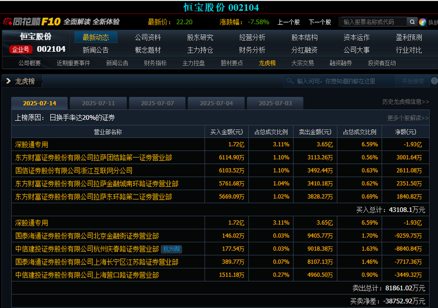恒宝股份今日涨停,杭州帮席位净买入1.04亿元