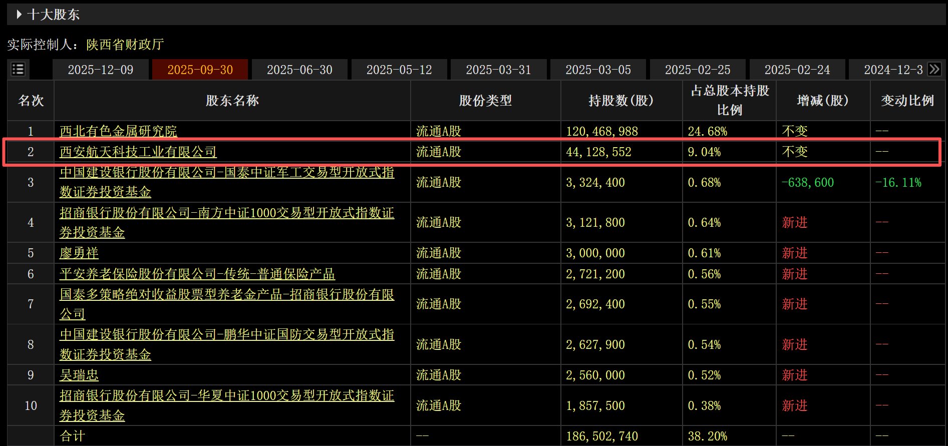 注:截至三季度末,西安航天位列西部材料第二大股东,持股4412.86万股,占公司总股本的9.04%。二级市场上,西部材料今日收盘价创历史新高,自11月 24日低点迄今股价累计最大涨幅达210%。 格隆汇1月6日|西部材料(002149.SZ)公告称,公司股东西安航天科技工业有限公司于2026年1月5日通过集中竞价交易方式减持公司股份合计479.91万股,占 公司总股本的0.9830%,其持有公司股份比例从8.5388%下降至7.5558%。 | ▶ 十大股东 | | | | | --- | --- | --- | --- | | 实际控制人:陕西省财政厅 | | | | | !!! | 2025-12-09 2025-09-30 2025-06-30 2025-05-12 | | 2025-03-31 | | 名次 | 股东名称 | | 股份类型 | | 1 | 西北有色金属研究院 | 流通A股 | | | 2 | 西安航天科技工业有限公司 | 流通A股 | | | 3 | 中国建设银行股份有限公司-国泰中证军工交易型开放式指 | 流通A股 | | | | 数证券投资基金 | | | | 4 | 招商银行股份 ...
