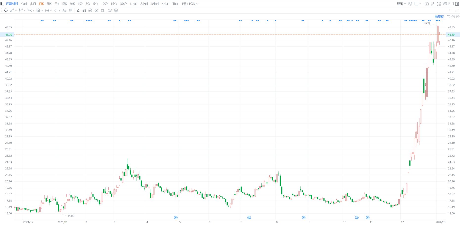 .. .. . . .. ... .. ��� 49.55 48.20 47.16 45.97 44.78 43.59 42.40 41.21 40.02 38.82 37.63 36.44 35.25 34.06 32.87 31.68 30.49 29.29 28.10 26.91 25.72 24.53 23.34 22.15 20.96 19.76 18.57 17.38 16.19 1 中心中国合 15.00 15.00 E ◎ 2025/01 2024/12 2 7 ■ 西部材料 分时 多日 日K 周K 月K 季K 年K 1分 3分 5分 10分 15分 30分 1小时 2小时 3小时 4小时 Tick 1天:1分K v 西部材料(002149.SZ)今日早盘一度跌6.99%至46.31元;该股昨日收涨8.17%并于盘中高见49.79元创历史新高,2025年全年累涨超1.6倍。西部材料昨日晚间公 告称,公司股东西安航天科技工业有限公司于2026年1月5日通过集中竞价交易方式减持公司股份合计479.91万股,占公司总股本的0.9830%。据悉,截至三 季度末,西安航天位列西部材料第二大股东。(格隆汇 ...