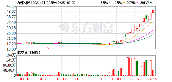证券时报·数据宝统计显示,西部材料所属的有色金属行业,目前整体跌幅为1.76%,行业内,目前股价 上涨的有23只,涨幅居前的有西部材料、斯瑞新材、宝钛股份等,涨幅分别为4.90%、3.27%、1.89%。 股价下跌的有119只,跌幅居前的有浩通科技、白银有色、贵研铂业等,跌幅分别为7.11%、6.11%、 6.01%。 两融数据显示,该股最新(12月24日)两融余额为12.39亿元,其中,融资余额为12.35亿元,近10日增 加3.37亿元,环比增长37.51%。 公司发布的三季报数据显示,前三季度公司共实现营业收入22.83亿元,同比增长2.82%,实现净利润 6925.44万元,同比下降49.76%,基本每股收益为0.1419元,加权平均净资产收益率2.33%。(数据宝) 西部材料股价再创历史新高,该股近期呈不断突破新高之势,近一个月累计有11个交易日股价刷新历史 纪录。截至09:37,该股目前上涨4.90%,股价报44.06元,成交2992.57万股,成交金额12.95亿元,换手 率6.13%,该股最新A股总市值达215.11亿元,该股A股流通市值215.07亿元。 ...