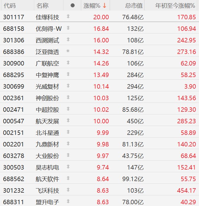 市场表现 - A股市场商业航天板块整体走强,多只个股出现大幅上涨,其中佳缘科技以20CM涨停领涨,西测测试涨幅超过18%,广联航空、中复神鹰涨幅超过15%,泛亚微透涨幅超过14%,光威复材涨幅超过12%,盟升电子涨近12%,航天软件涨幅超过10%,神剑股份、中超控股、航天发展、北斗星通、九鼎新材、大业股份等10CM涨停,昊志机电、邵阳液压涨幅超过9%,通宇通讯涨幅超过8% [1] - 部分个股在强劲上涨的同时创下历史新高,包括西测测试、泛亚微透、飞沃科技、昊志机电、通宇通讯、上海港湾、华菱线缆、九丰能源、天银机电 [2] 个股详情 - 佳缘科技涨幅20.00%,总市值76.48亿元,年初至今涨幅170.85% [2] - 优刻得-W涨幅16.84%,总市值132亿元,年初至今涨幅106.94% [2] - 西测测试涨幅16.00%,总市值108亿元,年初至今涨幅242.95% [2] - 泛亚微透涨幅14.32%,总市值78.81亿元,年初至今涨幅273.16% [2] - 广联航空涨幅14.26%,总市值106亿元,年初至今涨幅62.09% [2] - 中复神鹰涨幅13.49%,总市值284亿元,年初至今涨幅58.25% [2] - 光威复材涨幅10.14%,总市值294亿元,年初至今涨幅3.90% [2] - 神剑股份涨幅10.03%,总市值125亿元,年初至今涨幅143.56% [2] - 中超控股涨幅10.02%,总市值85.68亿元,年初至今涨幅129.30% [2] - 航天发展涨幅10.00%,总市值450亿元,年初至今涨幅285.23% [2] - 北斗星通涨幅9.99%,总市值229亿元,年初至今涨幅58.89% [2] - 九鼎新材涨幅9.98%,总市值81.13亿元,年初至今涨幅140.20% [2] - 大业股份涨幅9.97%,总市值43.75亿元,年初至今涨幅68.64% [2] - 昊志机电涨幅9.74%,总市值147亿元,年初至今涨幅152.41% [2] - 航天软件涨幅8.64%,总市值99.12亿元,年初至今涨幅55.75% [2] - 飞沃科技涨幅8.63%,总市值103亿元,年初至今涨幅454.17% [2] - 盟升电子涨幅8.63%,总市值78.00亿元,年初至今涨幅40.29% [2] 行业动态 - 我国在海南商业航天发射场使用长征八号甲运载火箭,成功将卫星互联网低轨17组卫星发射升空,卫星顺利进入预定轨道,发射任务获得圆满成功 [3] - 证监会网站显示,商业航天公司蓝箭航天IPO辅导状态已变更为“辅导工作完成”,距离正式递交上市申请仅一步之遥 [3]