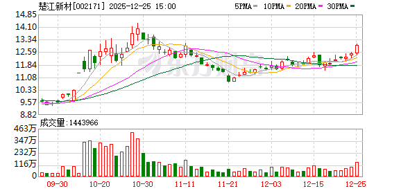 12月24日,楚江新材盘中上涨2.04%,截至10:22,报12.53元/股,成交3.69亿元,换手率1.86%,总市值 203.35亿元。 资金流向方面,主力资金净流出1176.12万元,特大单买入1312.20万元,占比3.56%,卖出1575.64万 元,占比4.27%;大单买入6221.62万元,占比16.87%,卖出7134.29万元,占比19.35%。 楚江新材今年以来股价涨52.80%,近5个交易日涨4.68%,近20日涨10.01%,近60日涨34.88%。 今年以来楚江新材已经1次登上龙虎榜,最近一次登上龙虎榜为10月16日,当日龙虎榜净买入3818.90万 元;买入总计3.58亿元 ,占总成交额比8.37%;卖出总计3.20亿元 ,占总成交额比7.48%。 资料显示,安徽楚江科技新材料股份有限公司位于安徽省芜湖市鸠江区龙腾路88号,成立日期2005年12 月21日,上市日期2007年9月21日,公司主营业务涉及有色金属(铜金属)材料的研发、加工、销售,新材 料热工装备业务,高性能碳纤维复合材料预制件生产业务。主营业务收入构成为:铜基材料96.79%,高 端装备、碳纤维复合材料2.09%,钢 ...