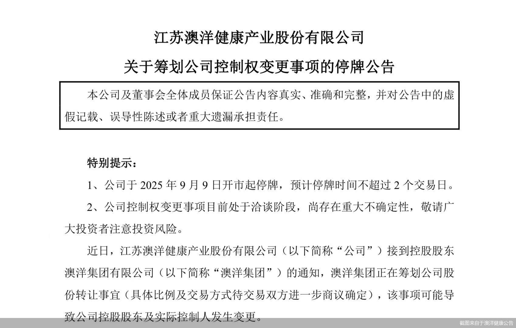 公司控制权变更筹划 - 澳洋健康控股股东澳洋集团正在筹划公司股份转让事宜 可能导致公司控股股东及实际控制人发生变更 [1] - 具体转让比例及交易方式尚待交易双方进一步商议确定 [1] - 公司股票自2025年9月9日开市起停牌 预计停牌时间不超过2个交易日 [1] 停牌安排 - 停牌原因为维护广大投资者利益 因事项处于洽谈阶段且存在重大不确定性 [1] - 停牌依据《深圳证券交易所股票上市规则》及《深圳证券交易所上市公司自律监管指引第6号——停复牌》相关规定执行 [1]