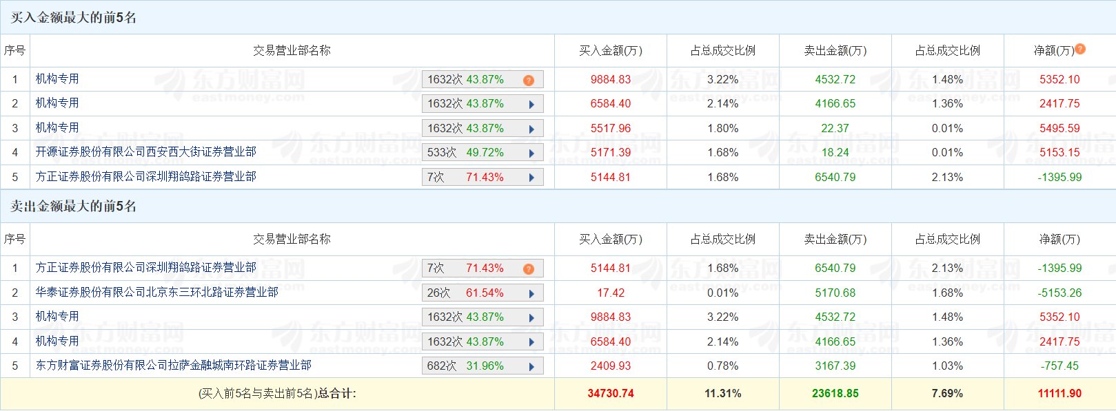 股价表现 - 公司今日涨停 成交额30.71亿元 换手率30.55% [1] 机构资金动向 - 3家机构专用席位净买入1.33亿元 [1]