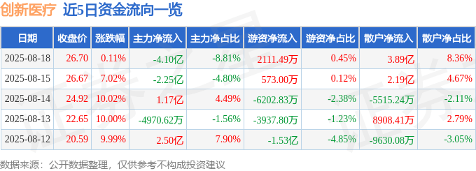 股票行情快报:创新医疗(002173)8月18日主力资金净卖出4.10亿元