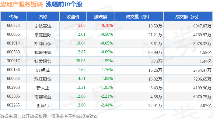 从资金流向上来看,当日房地产服务板块主力资金净流出6115.77万元,游资资金净流入392.03万元,散 户资金净流入5723.74万元。房地产服务板块个股资金流向见下表: 证券之星消息,1月6日房地产服务板块较上一交易日上涨0.37%,皇庭国际领涨。当日上证指数报收于 4083.67,上涨1.5%。深证成指报收于14022.55,上涨1.4%。房地产服务板块个股涨跌见下表: | 代码 | 名称 | 收盘价 | 涨跌幅 | 成交量(手) | 成交额(元) | | --- | --- | --- | --- | --- | --- | | 000056 | 皇庭国际 | 2.10 | 4.48% | 60.96万 | 1.27亿 | | 002285 | 世联行 | 3.02 | 1.34% | 131.98万 | ZAGGTE | | 300917 | 特发服务 | 40.52 | 1.33% | 5.55万 | 2.24亿 | | 603506 | 南都物业 | 13.17 | 0.84% | 5.80万 | 7607.64万 | | 000560 | 我筹找家 | 2.97 | 0.68% | 170.4 ...