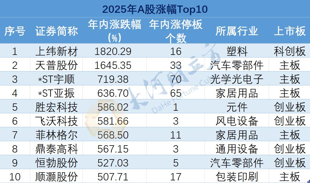 【大河财立方 见习记者 金怡杉】2025年12月31日,A股正式收官。这一年,近八成个股(4230只股票)实现全年上涨;沪指累计上涨18.41%,2921只 个股跑赢大盘;540只个股股价翻倍;10只大牛股涨幅超500%,成为投资者眼中的"造富机器"。 | | | | 2025年A股涨幅Top10 | | | | --- | --- | --- | --- | --- | --- | | 序号 | 证券简称 | 年内涨跌幅 年内涨停板 | | 所属行业 | 上市板 | | | | (%) | 个数 | | | | T | 上纬新材 | 1820.29 | 16 | 朝お | 科创板 | | 2 | 天普股份 | 1645.35 | 33 | 汽车零部件 | 主板 | | 3 | *ST宇顺 | 719.38 | 70 | 光学光电子 | 主板 | | 4 | *ST业振 | 636.70 7 | 6hxUl' | 家居用品 | 主板 | | 5 | 胜宏科技 | 586.02 02 0216 1 | | 元件 | 创业板 | | 6 | 飞沃科技 | 581.66 | 3 | 风电设备 | 创业板 | | 7 ...