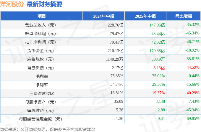 洋河股份2025年中报简析:净利润同比下降45.34%,三费占比上升明显