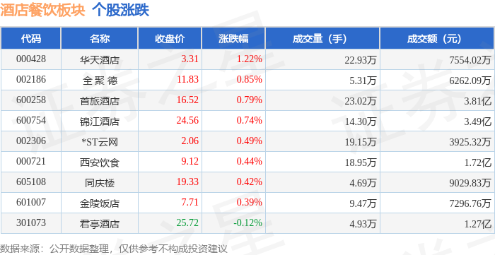 市场表现 - 2023年12月31日,酒店餐饮板块整体表现强劲,较上一交易日上涨2.63% [1] - 当日上证指数微涨0.09%至3968.84点,深证成指下跌0.58%至13525.02点,酒店餐饮板块表现显著跑赢大盘 [1] - 板块内个股普涨,首旅酒店以4.17%的涨幅领涨,锦江酒店紧随其后,上涨3.78% [1] - 板块内仅*ST云网一只股票下跌,跌幅为4.78% [1] 个股交易情况 - 首旅酒店收盘价为16.75元,成交22.12万手,成交额达3.67亿元 [1] - 锦江酒店收盘价为25.27元,成交16.91万手,成交额达4.23亿元 [1] - 全聚德收盘价为11.78元,上涨1.99%,成交7.74万手,成交额为9011.25万元 [1] - 金陵饭店、同庆楼、华天酒店、君亭酒店、西安饮食均有不同程度上涨,涨幅在0.11%至1.17%之间 [1] 资金流向 - 当日酒店餐饮板块整体获得主力资金净流入2116.25万元,游资资金净流入1545.3万元,散户资金净流出3661.55万元 [1] - 锦江酒店获得主力资金净流入最多,为2679.93万元,主力净占比为6.34% [2] - 首旅酒店获得主力资金净流入2258.52万元,主力净占比为6.15% [2] - 全聚德获得主力资金净流入451.83万元,主力净占比为5.01% [2] - *ST云网、西安饮食、君亭酒店、华天酒店呈现主力资金净流出,其中*ST云网主力资金净流出1235.87万元,主力净占比为-17.29% [2]