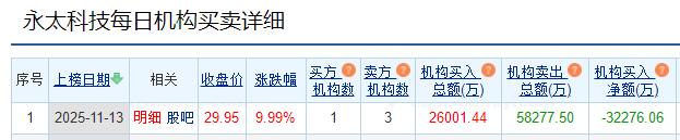 永太科技涨停,龙虎榜上机构买入2.60亿元,卖出5.83亿元