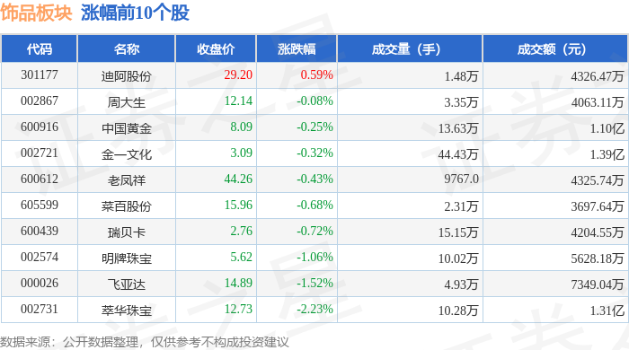 | 代码 | 名称 | 收盘价 | 涨跌幅 | 成交量(手) | 成交额(元) | | | --- | --- | --- | --- | --- | --- | --- | | 301177 | 迪阿股份 | 29.20 | 0.59% | 1.48万 | | 4326.47万 | | 002867 | 周大生 | 12.14 | -0.08% | 3.35万 | | 4063.11万 | | 600916 | 中国黄金 | 8.09 | -0.25% | 13.63万 | | 1.10亿 | | 002721 | 金一文化 | 3.09 | -0.32% | 44.43万 | | 1.39亿 | | 600612 | 老凤祥 | 44.26 | -0.43% | 9767.0 | | 4325.74万 | | 605599 | 菜自股份 | 15.96 | -0.68% | 2.31万 | | 3697.64万 | | 600439 | 瑞贝卡 | 2.76 | -0.72% | 15.15万 | | 4204.55万 | | 002574 | 明牌珠宝 | 5.62 | -1.06% | 10.02万 ...