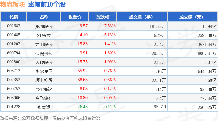 物流板块市场表现 - 2023年12月29日,物流板块整体下跌1.01%,表现弱于大盘,当日上证指数上涨0.04%,深证成指下跌0.49% [1] - 板块内个股表现分化,龙洲股份领涨,涨幅为7.53%,厦门国贸领跌,跌幅为9.98% [1][2] - 从资金流向看,当日物流板块主力资金净流出6.18亿元,游资资金净流入2.05亿元,散户资金净流入4.13亿元 [2] 领涨个股详情 - 龙洲股份收盘价9.57元,上涨7.53%,成交额16.94亿元,成交量181.72万手,主力资金净流入398.19万元,占比0.24% [1][3] - ST雪发收盘价4.10元,上涨5.13%,成交额2592.30万元,成交量6.49万手,主力资金净流入421.60万元,占比16.26% [1][3] - 炬申股份收盘价15.83元,上涨1.41%,成交额3671.44万元,成交量2.34万手 [1] - 保税科技收盘价3.91元,上涨1.30%,成交额8007.41万元,成交量120.55万手,主力资金净流入1116.93万元,占比13.95% [1][3] 领跌个股详情 - 厦门国贸收盘价7.85元,下跌9.98%,成交额18.50亿元,成交量233.19万手 [2] - 瑞茂通收盘价3.51元,下跌4.88%,成交额1.41亿元,成交量39.96万手 [2] - 申通快递收盘价13.46元,下跌3.86%,成交额4.32亿元,成交量31.89万手 [2] - 东方嘉盛收盘价15.73元,下跌2.66%,成交额1.26亿元,成交量7.94万手 [2] 重点公司资金流向 - 顺丰控股主力资金净流入1.28亿元,净占比14.71%,但游资和散户资金分别净流出5128.33万元和7647.89万元 [3] - 圆通速递主力资金净流入1262.26万元,净占比3.14%,游资净流入1559.71万元,但散户资金净流出2821.97万元 [3] - 建发股份主力资金净流入1498.94万元,净占比8.05% [3] - 宏川智慧主力资金净流入740.34万元,净占比14.00% [3]