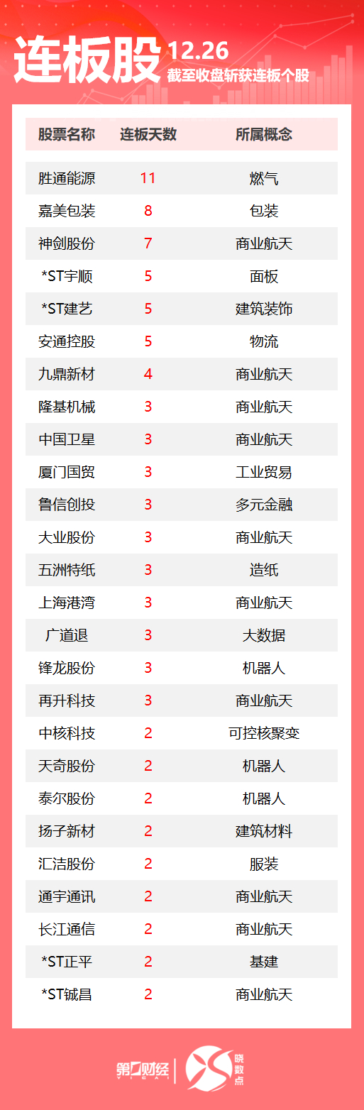 | 再升科技 | 3 | 商业航天 | | --- | --- | --- | | 中核科技 | 2 | 可控核聚变 | | 天奇股份 | 2 | 机器人 | | 泰尔股份 | 2 | 机器人 | | 扬子新材 | 2 | 建筑材料 | | 汇洁股份 | 2 | 服装 | | 通宇通讯 | 2 | 商业航天 | | 长江通信 | 2 | 商业航天 | | *ST正平 | 2 | 基建 | | *ST铖昌 | 2 | 商业航天 | 第口财经 | | 连板成 | 12.26 | | | --- | --- | --- | | | | 截至收盘斩获连板个股 | | 股票名称 | 连板天数 | 所属概念 | | 胜通能源 | 11 | 燃气 | | 嘉美包装 | 8 | 包装 | | 神剑股份 | 7 | 商业航天 | | *ST宇顺 | 5 | 面板 | | *ST建艺 | 5 | 建筑装饰 | | 安通控股 | 5 | 物流 | | 九鼎新材 | 4 | 商业航天 | | 隆基机械 | 3 | 商业航天 | | 中国内星 | 3 | 商业航天 | | 厦门国贸 | 3 | 工业贸易 | | 鲁信创投 | 3 | ...