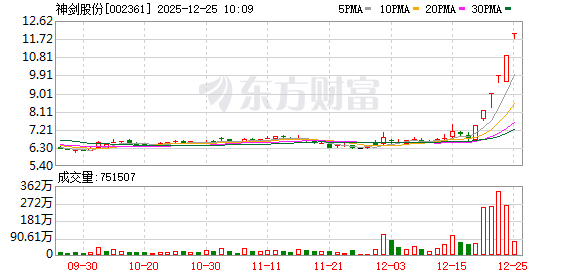 神剑股份盘中涨停,已连收6个涨停板,截至9:25,该股报11.97元,换手率3.87%,成交量3131.10万 股,成交金额3.75亿元,涨停板封单金额为266.57万元。连续涨停期间,该股累计上涨77.33%,累计换 手率为148.00%。最新A股总市值达113.84亿元,A股流通市值96.85亿元。 证券时报·数据宝统计,两融数据来看,该股最新(12月24日)两融余额为6.03亿元,其中,融资余额 6.03亿元,较前一个交易日增加1.13亿元,环比增长23.01%,近6日累计增加1.31亿元,环比增长 27.67%。 近日该股表现 | 日期 | 当日涨跌幅(%) | 换手率(%) | 主力资金净流入(万元) | | --- | --- | --- | --- | | 2025.12.24 | 10.01 | 32.12 | -3336.32 | | 2025.12.23 | 10.01 | 41.59 | 21588.83 | | 2025.12.22 | 10.04 | 31.53 | -2173.94 | | 2025.12.19 | 9.96 | 30.98 | -15295.99 | | 2025 ...