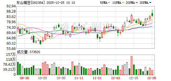 东山精密股价创出历史新高,截至9:37,该股上涨5.60%,股价报88.81元,成交量1922.07万股,成交金 额16.74亿元,换手率1.39%,该股最新A股总市值达1626.65亿元,该股A股流通市值1231.19亿元。 证券时报·数据宝统计显示,东山精密所属的电子行业,目前整体涨幅为0.75%,行业内,目前股价上涨 的有257只,涨幅居前的有恒烁股份、臻镭科技、腾景科技等,涨幅分别为18.35%、15.62%、10.68%。 股价下跌的有212只,跌幅居前的有芯原股份、天通股份、中富电路等,跌幅分别为4.10%、3.45%、 3.07%。 两融数据显示,该股最新(12月24日)两融余额为52.95亿元,其中,融资余额为52.84亿元,近10日减 少9.03亿元,环比下降14.59%。 公司12月22日在交易所互动平台披露,截至最新(12月20日)股东户数为90652户,较上期(12月10 日)增加10876户,环比增长13.63%。 公司发布的三季报数据显示,前三季度公司共实现营业收入270.71亿元,同比增长2.28%,实现净利润 12.23亿元,同比增长14.61%,基本每股收益为0.7000元, ...