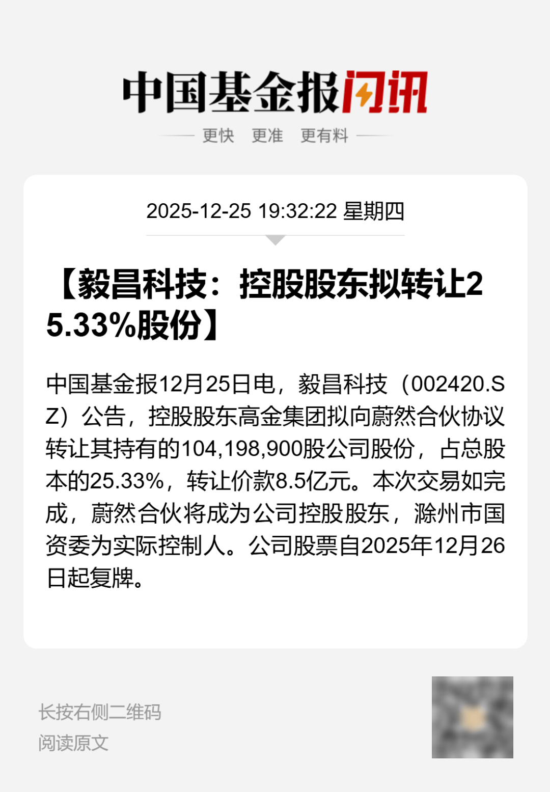 公司股价与交易表现 - 毅昌科技股票于12月26日复牌,收盘报7.86元,股价下跌6.76% [1] 控制权变更事项进程 - 公司于12月22日收到控股股东高金集团通知,其正在筹划公司控制权变更事宜,可能导致控股股东及实际控制人发生变更,因事项存在不确定性,公司股票自12月23日起停牌 [1] - 12月24日,因控制权变更事宜仍在洽谈中,公司申请股票自12月25日起继续停牌 [2] - 12月25日,控股股东高金集团与滁州蔚然科技发展合伙企业(有限合伙)签署《股份转让协议》,蔚然合伙拟以85,000.00万元人民币受让高金集团持有的104,198,900股股份,占公司总股本的25.33% [2] - 若交易完成,蔚然合伙将成为公司控股股东,滁州市人民政府国有资产监督管理委员会将成为公司实际控制人 [2] - 该控制权变更事项尚在进行中,需履行相关审批程序,最终能否实施及结果存在不确定性 [3] 停复牌安排 - 公司最初申请停牌时间预计不超过2个交易日 [1] - 后续申请继续停牌时间预计也不超过2个交易日 [2] - 公司股票最终于12月26日上午开市起复牌 [1]