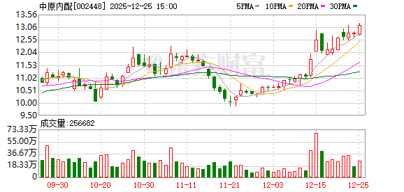 12月25日,中原内配盘中上涨2.11%,截至10:23,报13.08元/股,成交1.16亿元,换手率1.97%,总市值 76.96亿元。 中原内配所属申万行业为:汽车-汽车零部件-底盘与发动机系统。所属概念板块包括:航天军工、无人 机、长安汽车概念、燃料电池、无人驾驶等。 截至12月10日,中原内配股东户数4.76万,较上期减少1.40%;人均流通股9567股,较上期增加1.42%。 2025年1月-9月,中原内配实现营业收入28.67亿元,同比增长16.35%;归母净利润3.26亿元,同比增长 39.89%。 分红方面,中原内配A股上市后累计派现7.96亿元。近三年,累计派现2.18亿元。 机构持仓方面,截止2025年9月30日,中原内配十大流通股东中,招商量化精选股票发起式A (001917)位居第二大流通股东,持股430.61万股,相比上期增加143.01万股。平安匠心优选混合A (008949)位居第四大流通股东,持股380.36万股,为新进股东。长城久富混合(LOF)A(162006)位 居第五大流通股东,持股296.76万股,为新进股东。平安鼎信债券A(002988)位居第六大流通股东, 持股2 ...