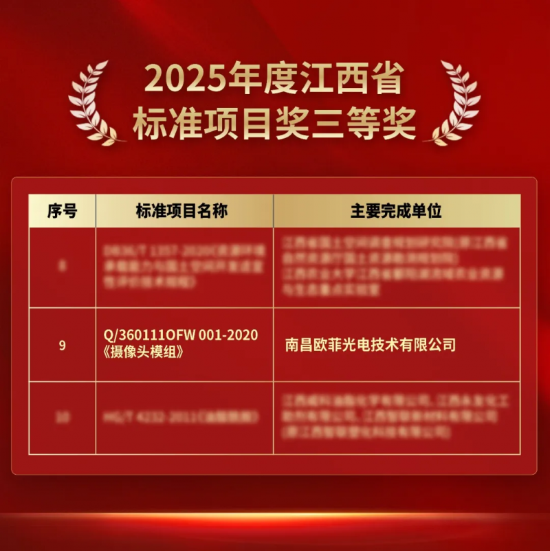 近日,2025年度江西省省长质量奖系列奖项获奖名单揭晓。欧菲光集团股份有限公司的子公司——南昌 欧菲光电技术有限公司凭借其制定的摄像头模组企业标准,成功荣获"江西省标准项目奖"三等奖。这一 荣誉是对该公司在标准制定与创新方面所作贡献的官方认可。 | | 2025年度江西省 | | --- | --- | | | 标准项目奖三等奖 | | 序号 | 标准项目名称 主要完成单位 | | | �碓矗分�碓矗�������� ������������� ������������ DESARIES CONSERVE STERCERY | | 9 | Q/360111OFW 001-2020 南昌欧菲光电技术有限公司 《摄像头模组》 | | | 【的城市场面化平台湾北路 工程与重要工 HG/T 4232-2011(金幅限量) 影院看看出典, (西智能影视剧剧剧) | "江西省标准项目奖"是整合升级后的江西省省长质量奖的重要组成部分,旨在表彰在标准领域取得突出 成就的项目。本届评选竞争激烈,共评出一等奖5项、二等奖10项、三等奖15项。经过评委会多轮严格 评审,最终确定了这份具有代表性的获奖名单。 欧菲光是全球光学光电领域 ...