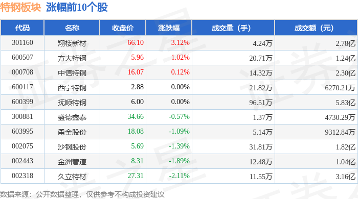 特钢板块市场表现 - 2023年12月29日,特钢板块整体下跌0.71%,表现弱于大盘,当日上证指数上涨0.04%,深证成指下跌0.49% [1] - 板块内个股表现分化,翔楼新材领涨,涨幅为3.12%,收盘价66.10元;常宝股份领跌,跌幅为3.41%,收盘价8.77元 [1][2] - 板块成交活跃,抚顺特钢成交量最大,为96.51万手,成交额5.83亿元;太钢不锈成交额最高,为5.76亿元 [1][2] 特钢板块资金流向 - 当日特钢板块整体呈现主力资金净流出状态,净流出金额为3.03亿元 [2] - 游资与散户资金呈净流入,其中游资净流入1148.09万元,散户净流入2.92亿元 [2] - 个股层面,方大特钢是唯一录得主力资金净流入的股票,净流入334.01万元,主力净占比2.70% [3] - 沙钢股份主力资金净流出最为显著,净流出4964.39万元,主力净占比高达-27.28% [3] - 中信特钢获得游资青睐,游资净流入2305.40万元,游资净占比10.01% [3]
