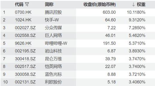 游戏传媒ETF(517770)紧密跟踪中证沪港深游戏及文化传媒指数,该指数精选沪港深三地市场中业务 涉及游戏、影视、广播电视、广告营销、出版、教育及文化演出等领域的50只优质上市公司证券,覆盖 文化娱乐产业链;特别是在涵盖香港市场的游戏和传媒公司方面,快手、腾讯控股、哔哩哔哩等龙头企 业作为权重股。 | | 代码 7 | 简称 | 收盘价(原始币种) | ↓ 权重 | | --- | --- | --- | --- | --- | | 1 | 0700.HK | 腾讯控股 | 603.00 | 10.1180% | | 2 | 1024.HK | 快手-W | 64.60 | 9.3120% | | 3 | 002027.SZ | 分众传媒 | 7.22 | 7.2850% | | র্ব | 002558.SZ | 巨人网络 | 46.01 | 5.4620% | | 5 | 9626.HK | 些伊些明-W | 191.50 | 5.3710% | | 6 | 002195.SZ | 岩山科技 | 6.87 | 3.8930% | | 7 | 300418.SZ | 昆仑万维 | 39.79 | 3.74 ...