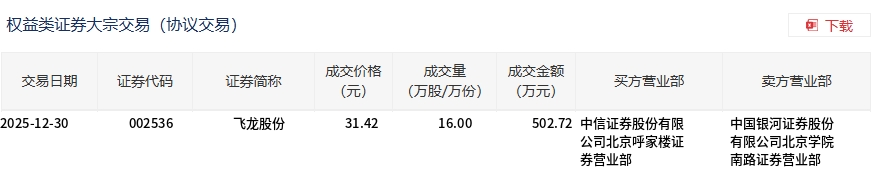 | 交易日期 | 证券代码 | 证券简称 | 成交价格 | 成交量 | 成交金额 买方营业部 | 卖方营业部 | | --- | --- | --- | --- | --- | --- | --- | | | | | (元) | (万股/万份) | (万元) | | | 2025-12-30 | 002536 | 飞龙股份 | 31.42 | 16.00 | 502.72 中信证券股份有限 | 中国银河证券股份 | | | | | | | 公司北京呼家楼证 | 有限公司北京学院 | | | | | | | 券营业部 | 南路证券营业部 | 12月30日,飞龙股份大宗交易成交16万股,成交额502.72万元,占当日总成交额的0.15%,成交价31.42元,较市场收盘价 32.06元折价2%。 ...
