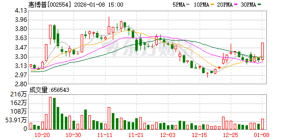 北京商报讯(记者 马换换 王蔓蕾)A股再现股价"抢跑"。1月8日晚间,惠博普(002554)披露公告 称,公司控股股东水业集团正筹划股权转让,转让股权比例为总股本的25%-30%,该事项可能导致公司 控股股东及实控人发生变更,公司股票自2026年1月9日起停牌,预计停牌时间不超过2个交易日。 据了解,惠博普是一家国际化的油气资源开发及利用综合解决方案服务商,公司主营业务包括油气工程 及运营服务(EPCC)、环境工程及服务、油气资源开发及利用。 交易行情显示,1月8日,惠博普股价收于涨停价3.55元/股,总市值约为47.35亿元,当日成交金额2.25 亿元。 ...