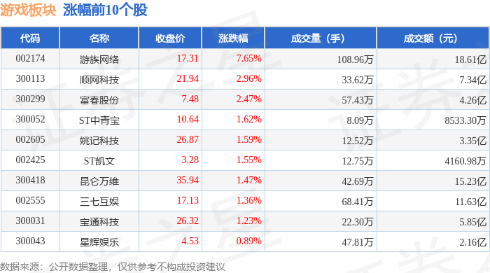 游戏板块整体表现 - 2024年8月14日游戏板块较上一交易日上涨0.15%,领涨个股为冰川网络(涨幅7.40%),当日上证指数下跌0.46%至3666.44点,深证成指下跌0.87%至11451.43点 [1] - 板块内10只个股上涨,涨幅最高前三分别为冰川网络(7.40%)、巨人网络(4.29%)、吉比特(2.81%) [1] - 板块内10只个股下跌,跌幅最大前三分别为宝通科技(-2.84%)、昆仑万维(-2.48%)、ST华通(-2.35%) [2] 个股交易数据 - 冰川网络收盘价40.37元,成交量40.44万手,成交额16.14亿元,为板块成交额第三高个股 [1] - 掌趣科技成交量349.16万手居板块首位,成交额21.04亿元位列第二;神州泰岳成交额27.03亿元居板块第一 [1] - 巨人网络成交量50.30万手,成交额14.92亿元;恺英网络成交量63.36万手,成交额12.78亿元 [1] - ST华通成交量115.43万手为下跌个股中最高,成交额16.14亿元;汤姆猫成交量203.76万手,成交额11.53亿元 [2] 资金流向分析 - 游戏板块整体主力资金净流出3.38亿元,游资资金净流入1.29亿元,散户资金净流入2.09亿元 [2] - 掌趣科技主力净流入1.78亿元(净占比8.47%),居板块首位;冰川网络主力净流入1.23亿元(净占比7.60%) [3] - 巨人网络主力净流入8909.68万元(净占比5.97%),游资净流入6148.82万元(净占比4.12%) [3] - 游族网络主力净流入7106.42万元(净占比6.16%);盛天网络主力净流入4934.93万元(净占比8.69%) [3] - 富春股份主力净流入1817.90万元(净占比4.53%);迅游科技主力净流入1116.97万元(净占比4.06%) [3]