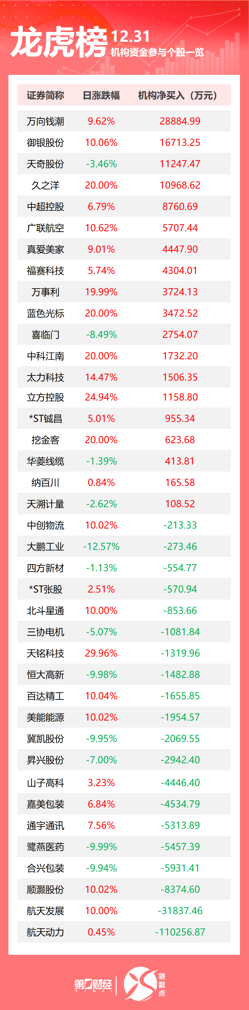龙虎榜机构资金整体动向 - 2017年12月31日龙虎榜数据显示,共有39只个股出现机构身影,机构呈现净买入的股票有19只,呈现净卖出的股票有20只 [1] 机构净买入重点个股 - 机构净买入金额最高的三只股票分别是万向钱潮、御银股份和天奇股份,净买入金额分别为2.89亿元、1.67亿元和1.12亿元 [1] - 万向钱潮当日股价上涨9.62%,获得机构净买入2.89亿元 [2] - 御银股份当日股价涨停(上涨10.06%),获得机构净买入1.67亿元 [2] - 天奇股份当日股价下跌3.46%,但仍获得机构净买入1.12亿元 [1][2] - 久之洋、中超控股、广联航空当日分别上涨20.00%、6.79%、10.62%,分别获得机构净买入1.10亿元、8760.69万元、5707.44万元 [2] - 蓝色光标、中科江南、立方控股当日均涨停(分别上涨20.00%、20.00%、24.94%),分别获得机构净买入3472.52万元、1732.20万元、1158.80万元 [3] 机构净卖出重点个股 - 机构净卖出金额最高的三只股票分别是航天动力、航天发展和顺灏股份,净流出金额分别为11.03亿元、3.18亿元和8375万元 [1] - 航天动力当日股价微涨0.45%,但遭遇机构大幅净卖出11.03亿元 [1][4] - 航天发展当日涨停(上涨10.00%),但遭遇机构净卖出3.18亿元 [1][4] - 顺灏股份当日涨停(上涨10.02%),但遭遇机构净卖出8375万元 [1][4] - 山子高科、嘉美包装、通宇通讯当日分别上涨3.23%、6.84%、7.56%,但分别遭遇机构净卖出4446.40万元、4534.79万元、5313.89万元 [4] - 鹭燕医药、合兴包装当日均跌停(分别下跌9.99%、9.94%),分别遭遇机构净卖出5457.39万元、5931.41万元 [4]