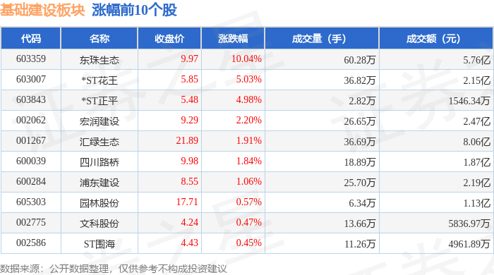 市场整体表现 - 12月30日,基础建设板块整体下跌0.46%,表现弱于大盘,当日上证指数收于3965.12点,基本持平(下跌0.0%),深证成指收于13604.07点,上涨0.49% [1] - 板块内个股表现分化,领涨股为东珠生态,涨幅达10.04%,领跌股为ST岭南,跌幅为4.71% [1][2] 个股涨跌情况 - 涨幅居前的个股包括:东珠生态(603359)涨10.04%,收于9.97元,成交额5.76亿元;*ST花王(603007)涨5.03%,收于5.85元;*ST正平(603843)涨4.98%,收于5.48元 [1] - 跌幅居前的个股包括:ST岭南(002717)跌4.71%,收于1.62元;苏文电能(300982)跌3.77%,收于20.40元;新疆交建(002941)跌2.85%,收于16.04元 [2] 板块资金流向 - 当日基础建设板块整体呈现主力资金净流出,净流出额为3.96亿元,而游资和散户资金则呈现净流入,分别为6549.62万元和3.3亿元 [2] - 个股资金流向分化显著,东珠生态(603359)主力资金净流入1.32亿元,净占比高达22.92%,但其游资和散户资金均为净流出 [3] - 汇绿生态(001267)获得主力资金净流入2551.11万元,同时游资净流入2802.01万元,但散户资金净流出5353.12万元 [3] - 宏润建设(002062)主力资金净流入2255.71万元,净占比9.14%,但其游资和散户资金均为净流出 [3]
