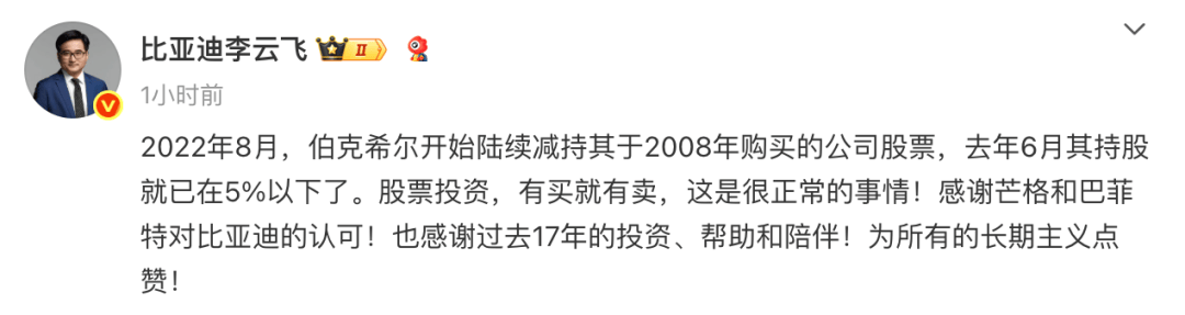 巴菲特清仓,比亚迪李云飞回应:股票有买就有卖,很正常的事情!