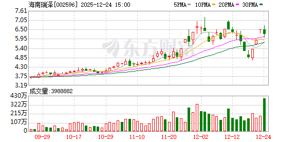 海南瑞泽盘中涨停,已连收3个涨停板,截至9:25,该股报6.48元,换手率1.17%,成交量1342.20万股, 成交金额8697.46万元,连续涨停期间,该股累计上涨33.33%,累计换手率为34.45%。最新A股总市值 达74.36亿元,A股流通市值74.29亿元。 | 日期 | 当日涨跌幅(%) | 换手率(%) | 主力资金净流入(万元) | | --- | --- | --- | --- | | 2025.12.22 | 10.09 | 14.29 | 15981.58 | | 2025.12.19 | 10.08 | 18.99 | 9765.22 | | 2025.12.18 | -6.90 | 13.42 | -883.57 | | 2025.12.17 | -10.00 | 11.28 | -6362.21 | | 2025.12.16 | -6.00 | 16.00 | -6628.17 | | 2025.12.15 | -2.53 | 12.34 | -1534.51 | | 2025.12.12 | -2.62 | 14.30 | -579.85 | | 2025.12.11 | -0 ...